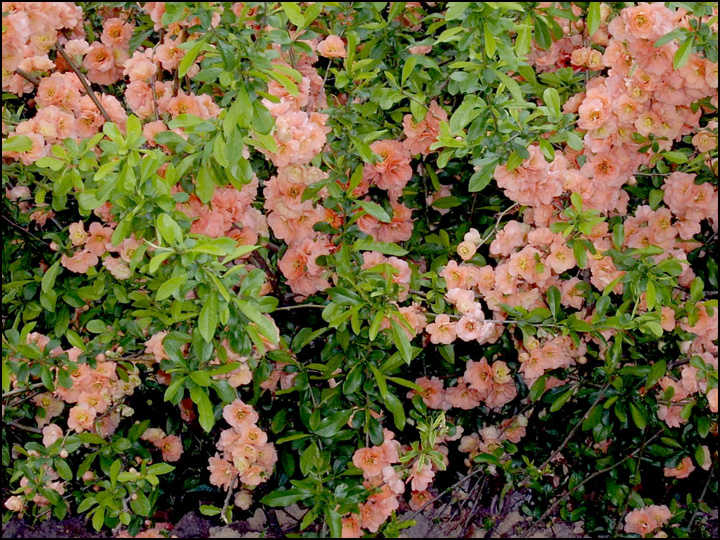 flowering quince; double apricot/apricot-peach colored flowers; best flowering in full sun