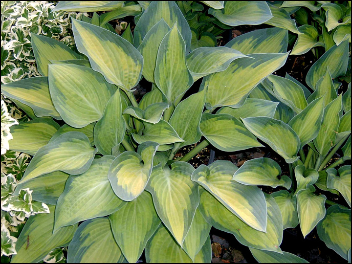 chartreuse centers turning yellow in the summer with blue-green margins, vigorous grower