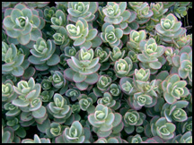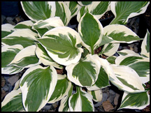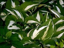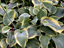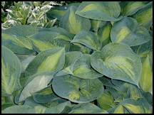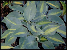 gold leaves edged w/blue-green margin, near white flowers; prefer light shade |
