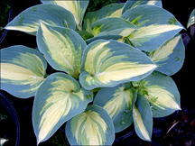 Hosta "Bright Lights" part shade; moist, well-drained soil; puckered yellow leaves with blue margins, white flowers |