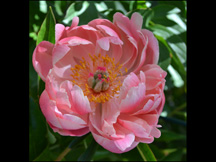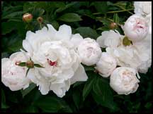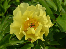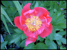 Peony 'Charles Burgess' 2 gallon $32 bright red blooms w/gold tipped stamens, Japanese variety w/dark green foliage, midseason bloomer |