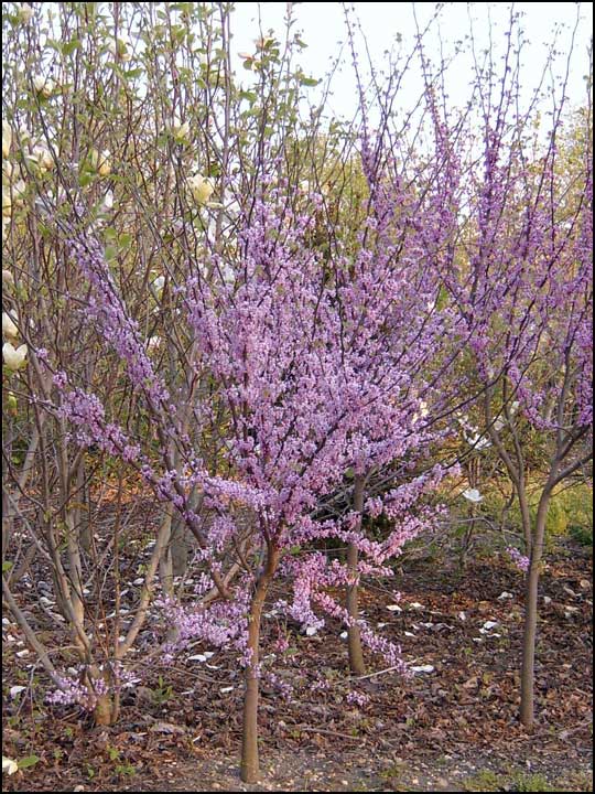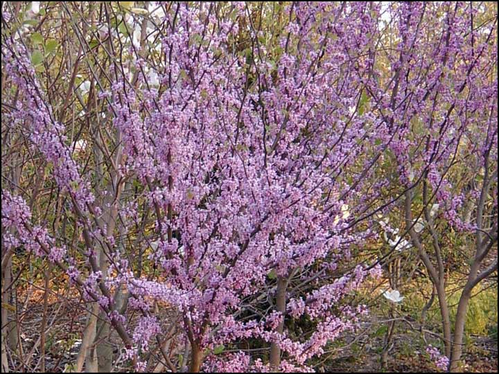 redbud, small flowering tree to 20-25', bright pink flowers along branches in early spring,