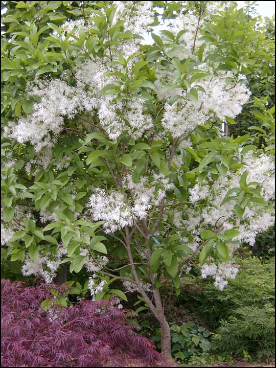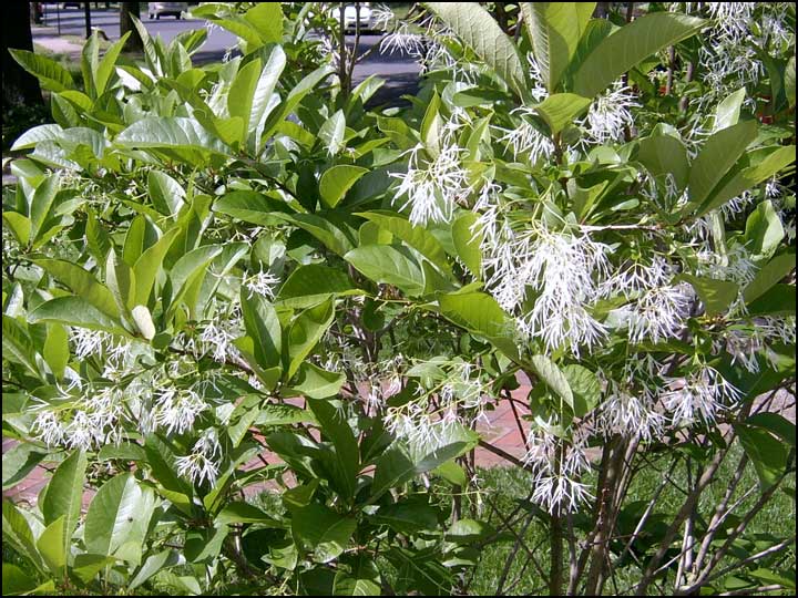 fringe tree or old man's beard, shiny dark green foliage with fragrant white panicles in mid May,