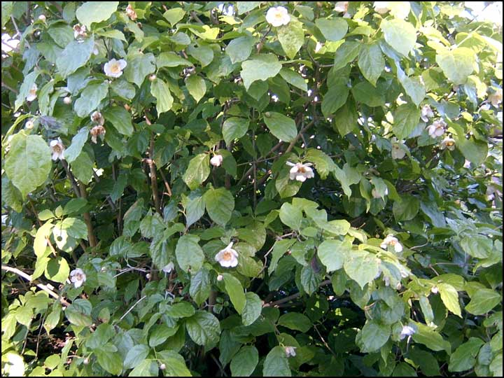 shiny light green foliage with camellia-like pinkish white flowers (4") in late spring on